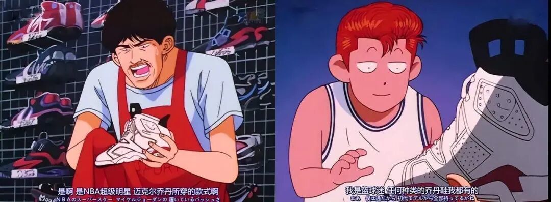 晴子带樱木去店里买鞋,对球鞋一无所知的樱木一眼相中了店长脚上的红白 AJ6。