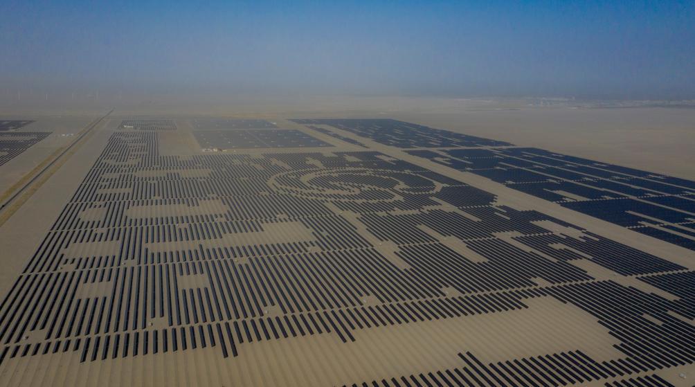 2025年9月22日在新疆巴音郭楞蒙古自治州若羌县拍摄的中国绿发新疆中绿电若羌400万千瓦光伏项目(无人机照片)。新华社记者陈朔 摄