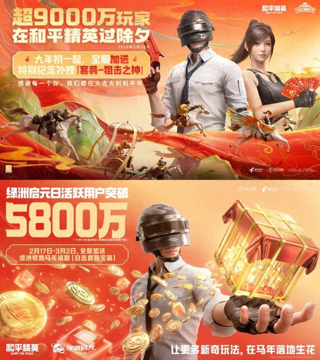 马年春节伊始,《和平精英》就用一份出色的成绩单在游戏圈投下了一枚重磅炸弹——除夕(2月16日)当天日活玩家突破9000万,绿洲启元玩法模块也在除夕当日创造了日活超5800万的数据新高。